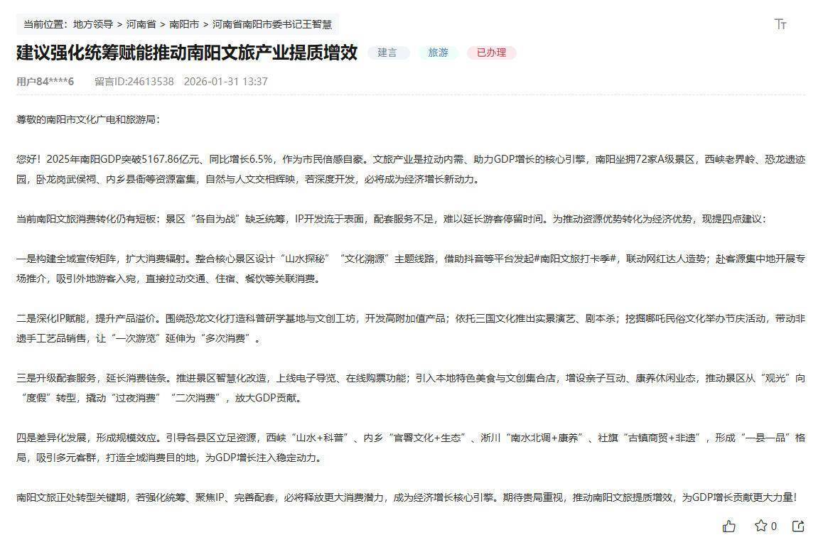 近日,河南一位群众通过人民网“领导留言板”提出的南阳文旅发展建议,因针对性、可操作性强,被当地相关部门深入研究并计划于今年落实。