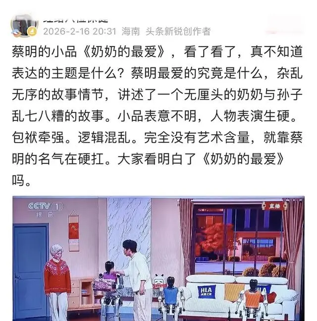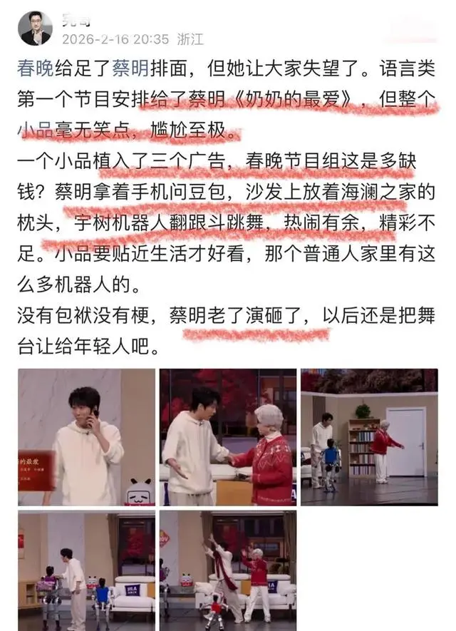 一个小品植入了三个广告,春晚节目组这是多缺钱?蔡明拿着手机问豆包,沙发上放着海澜之家的枕头,宇树机器人翻跟斗跳舞,热闹有余,精彩不足。小品要贴近生活才好看,那个普通人家里有这么多机器人的。