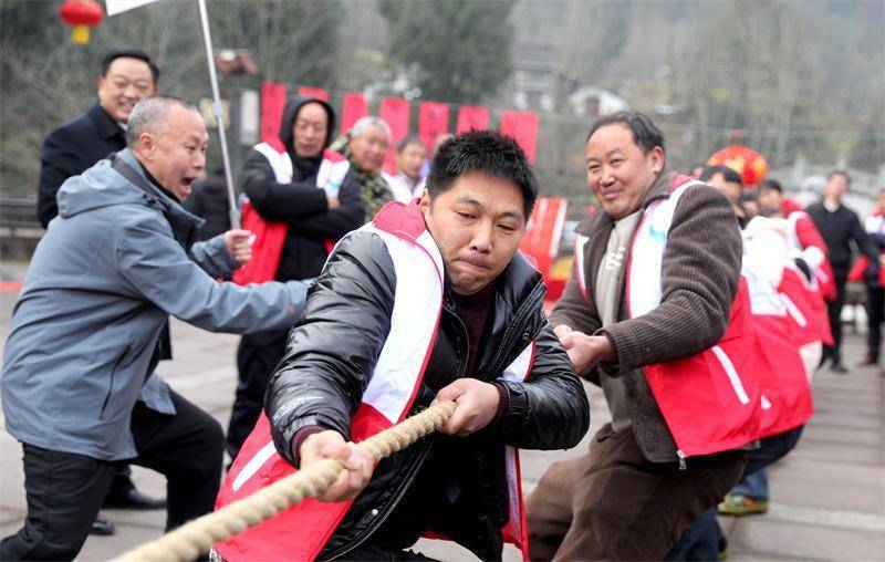 拔河比赛。高志农 摄“骏马迎春·福满月坝”。1月31日(腊月十三),广元市利州区白朝乡罗家老街张灯结彩,喜气洋洋。第六届月坝乡村年夜饭活动激情开幕,数百名村民与八方游客齐聚一堂,共同迎接农历马年新春。