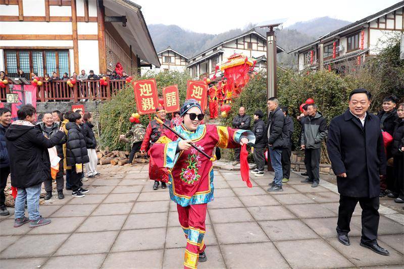 11时,喧天的锣鼓和嘹亮的唢呐声再次响起,一场充满仪式感的“龙凤呈祥·喜盈月坝”中式传统娶亲展演将气氛推向高潮。新郎身着红袍,胸佩大花,领着披红挂彩、吹吹打打的迎亲队伍,用八抬大轿从王家院子热热闹闹地迎出“新娘”。沿途“撒喜糖”“说喜话”,游客与村民争相拍照互动,孩子们追逐着撒出的彩色纸屑,老街变成了流动的欢乐海洋。