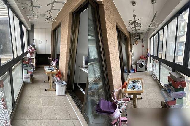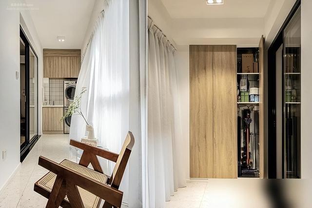 阳台打通更通透,洗衣机藏角柜,晾衣杆隐窗边。