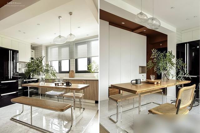 餐桌紧挨沙发摆,省下的地方塞张办公桌,边喝茶边赶工两不误。
