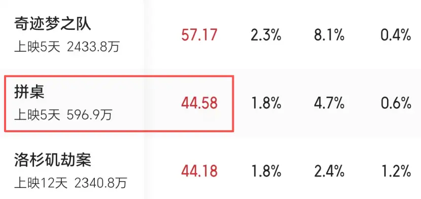本以为在演员有吸引力,再加上同档期“能打”的新片不多的情况下,《拼桌》怎么都能顺势小爆一波。