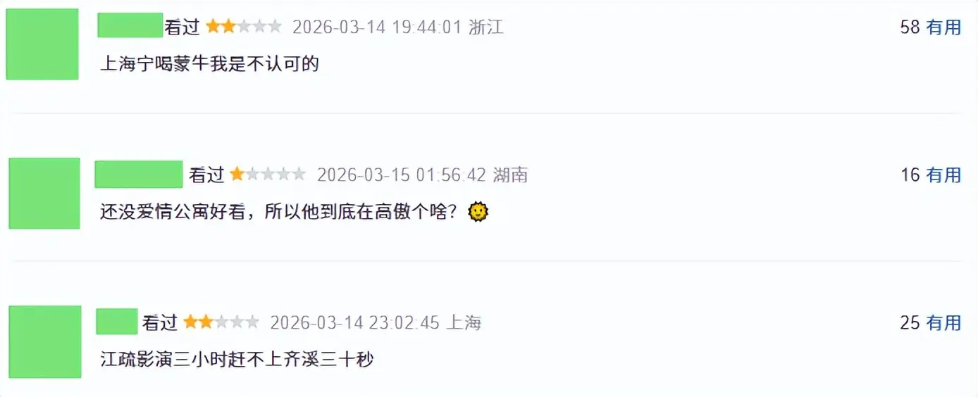 不仅如此,影片的口碑也一言难尽,点开豆瓣评论区,清一色一、二星,观众的评价无比犀利,甚至还有人说“江疏影演三小时赶不上齐溪三十秒”。