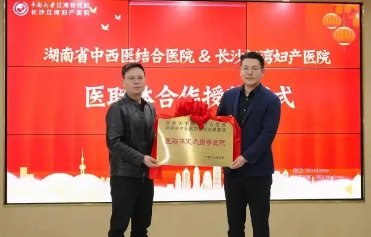4月22日,湖南省中西医结合医院(湖南省中医药研究院附属医院)与长沙江湾妇产医院正式达成医疗联合体合作。在现场热烈的掌声中,医联体授牌环节有序进行。湖南省中西医结合医院社会医学部部长黄上向长沙江湾妇产医院院长常明鸣正式授予医联体合作牌匾,双方握手合影留念,这也标志着两院医疗联合体合作关系正式落地生效。长沙江湾妇产医院院长常明鸣在发言中强调,能够与省内顶尖的中西医结合标杆医院深度携手共建医联体,是医院高质量发展进程中的重大机遇。后续医院将持续深耕学科内涵建设、强化内部专业人才培养、优化就医全流程便民服务,依托湖南省中西医结合医院雄厚的医疗底蕴和优质资源,让周边辖区百姓无需长途奔波、不用排队抢号,在家门口就能享受到国家级标准的优质中医医疗服务,以实干履职担当全力守护群众身心健康。揭牌见证合作新篇 实地交流敲定后续共建方向授牌仪式结束后,双方共同为医联体合作单位揭牌。随着红绸缓缓落下,崭新的医联体合作牌匾正式亮相,全体参会人员集体合影留念,定格下两院携手共进、协同发展的里程碑时刻。随后,双方实地参观走访了长沙江湾妇产医院健康楼一楼中医科诊疗区域,详细了解科室整体布局规划、专业诊疗配套设备、中医特色诊疗项目开展情况以及院内中西医结合临床诊疗工作